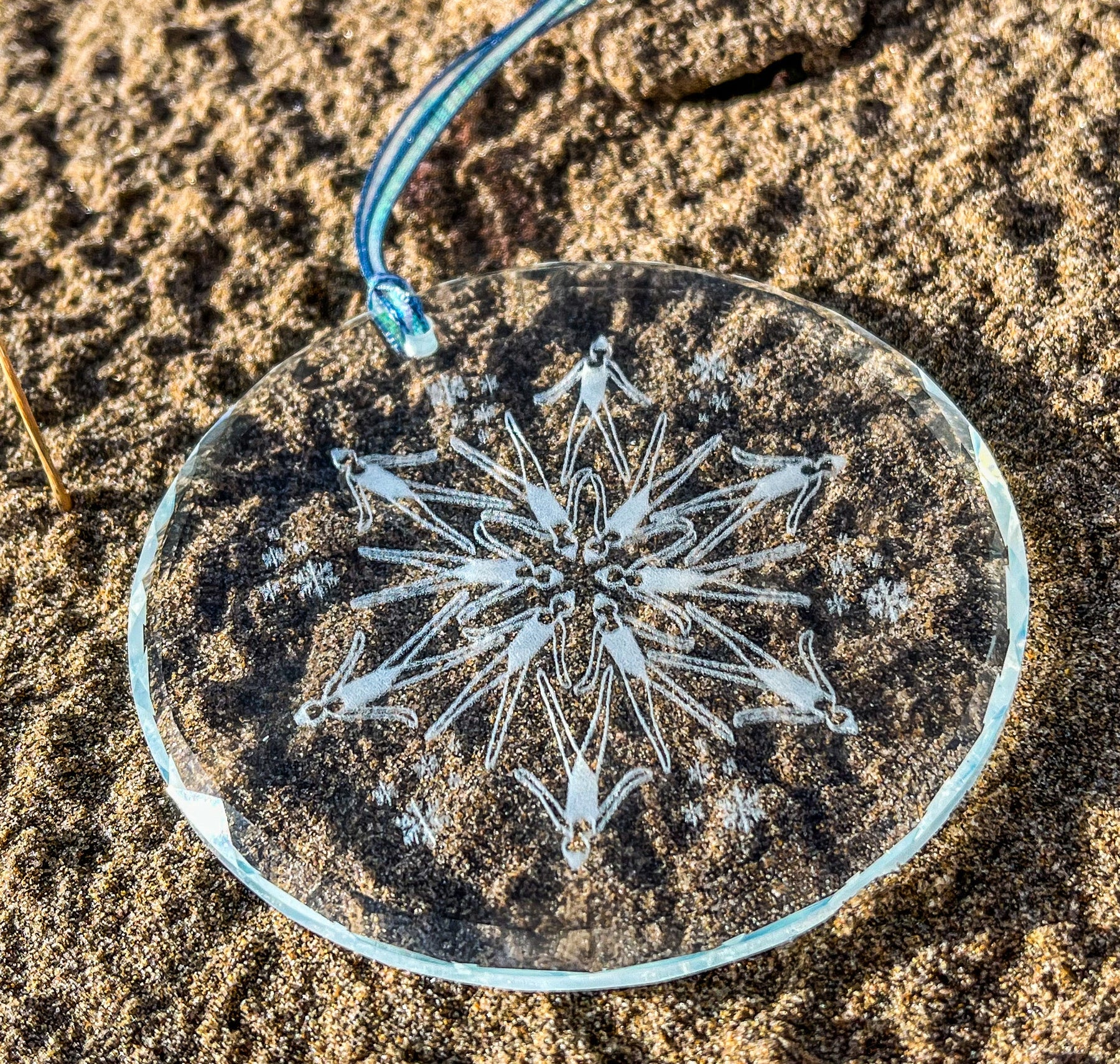 A stunning glass Christmas decoration featuring a snowflake of synchronized swimmers.