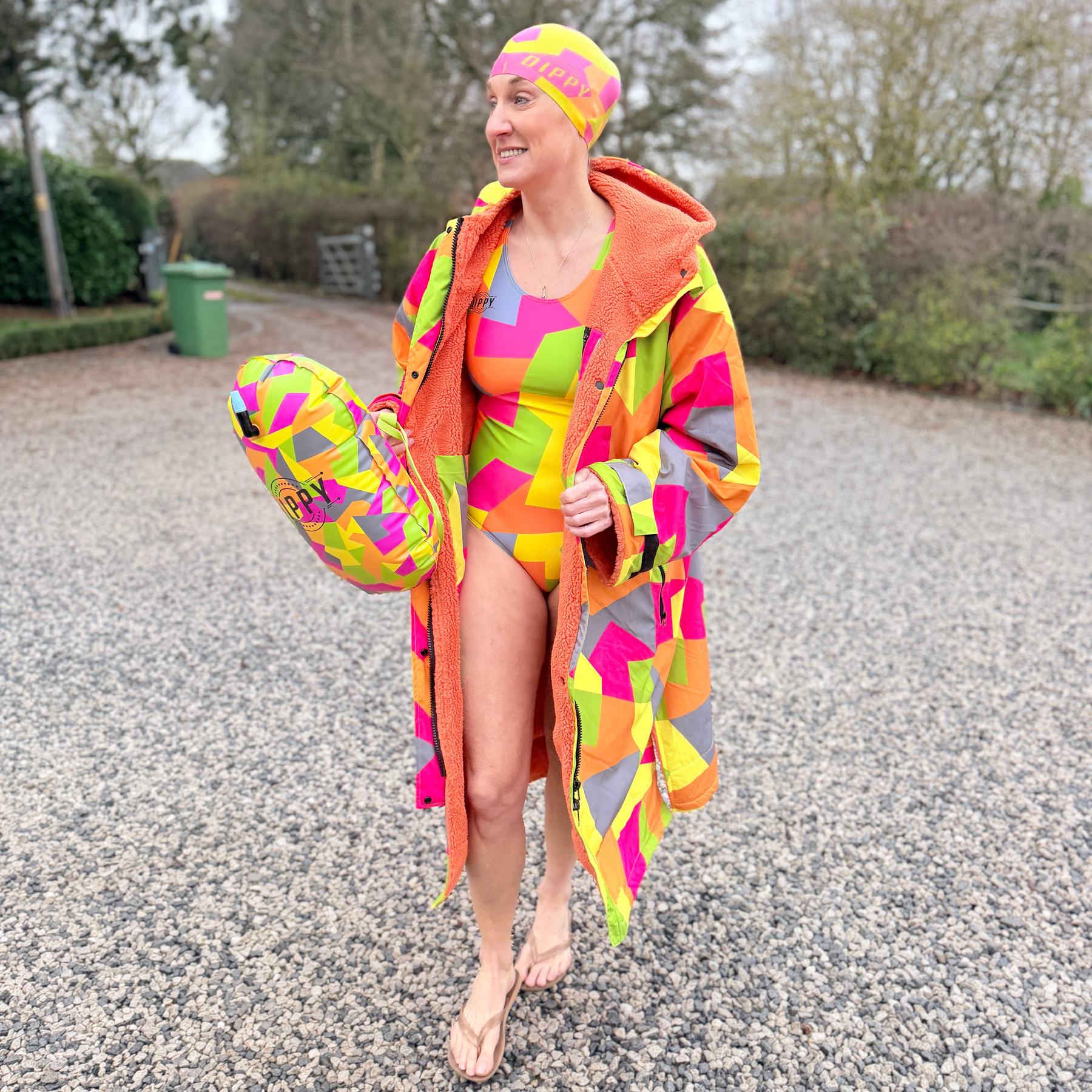 The bold Geo pattern adds a striking look and improves visibility for extra safety in the water. Lightweight and easy to put on or remove, the Dippy Swim Cap is your go to accessory for staying warm, safe, and stylish in every dip.