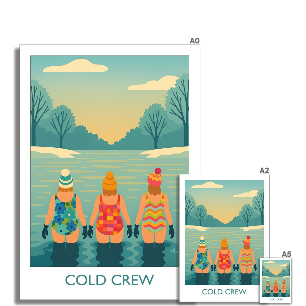 Cold Crew cold water swimming art print by Wild Swim Studio available in A0 to A5 sizes — vibrant illustration of winter swimmers, ideal wall art for open water enthusiasts.